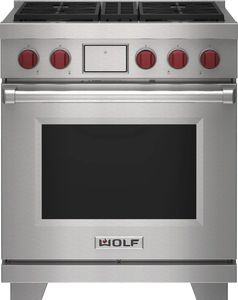 Wolf® 30" Stainless Steel Freestanding Dual Fuel Range features dual-stacked, sealed burners, Wolf’s Dual VertiFlow™ convection system, Gourmet Mode, 10 chef-created cooking modes, LED backlit control bezels, and a full-color touchscreen.Read More